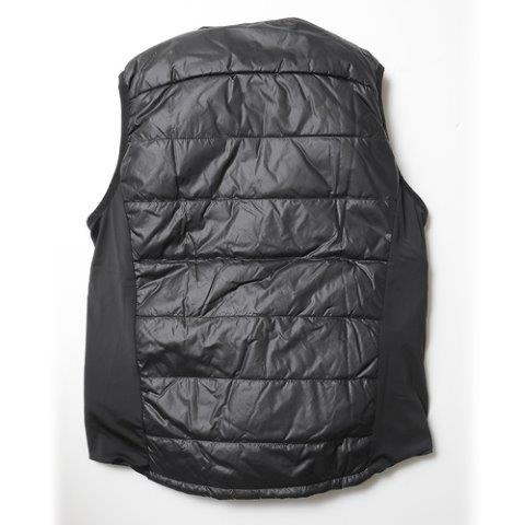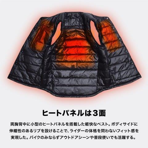 両胸背中に小型のヒートパネルを搭載した軽快なベスト。ボディサイドに伸縮性のあるリブを設けることで、 ライダーの体格を問わないフィット感を実現した。バイクのみならずアウトドアシーンや普段使いでも活躍する。